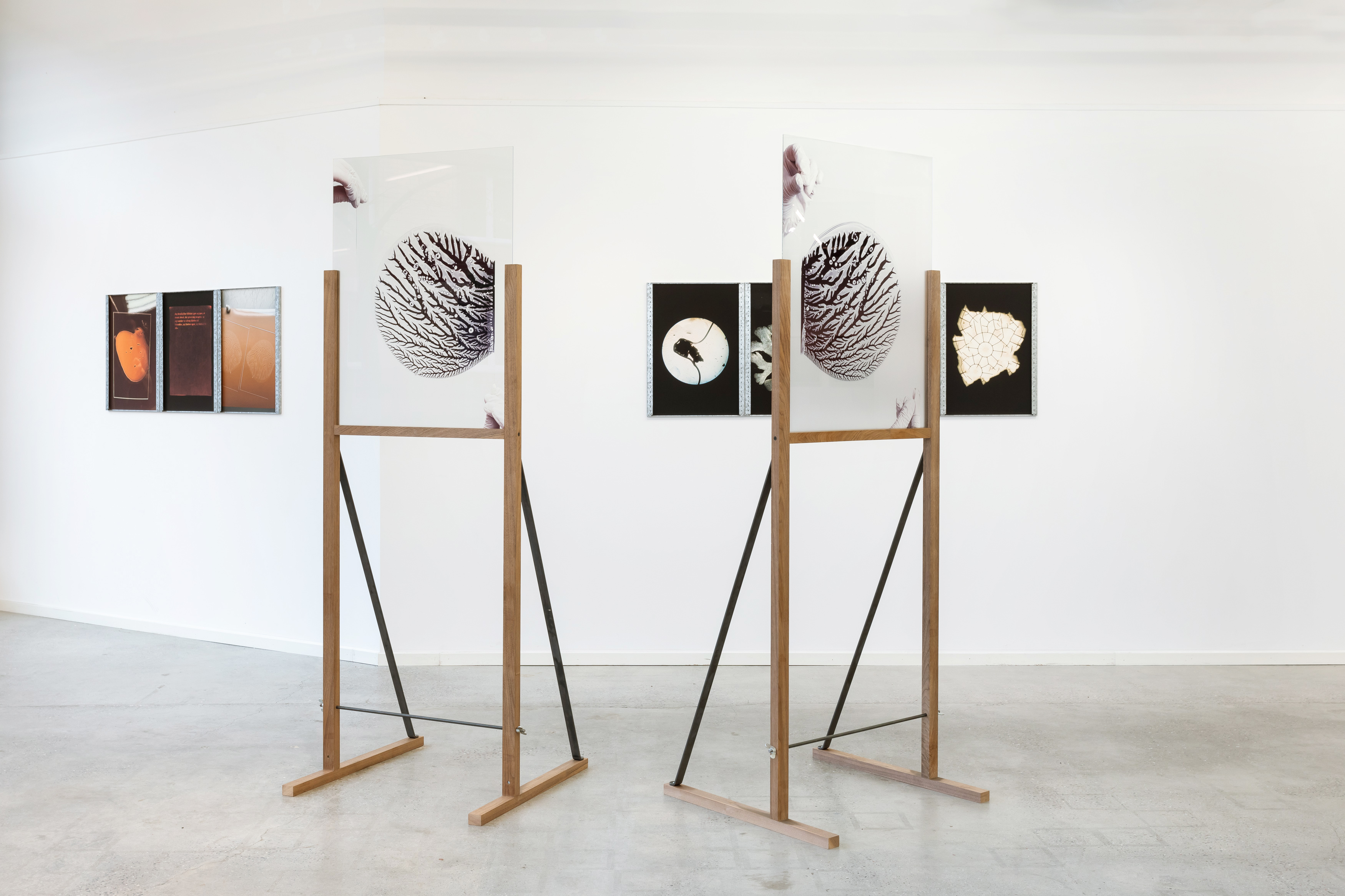 Branching serves as both a visual and conceptual thread: a structure of growth and connection found in trees, roots, and seed wings, but also a metaphor that shapes how we understand evolution, classification, and kinship. Another recurring element is fluidity and moisture—forces that catalyze change and exchange between materials. Even a trace of humidity can set transformation in motion, as in one work where glue’s residual moisture created an unexpected habitat for fungal growth.